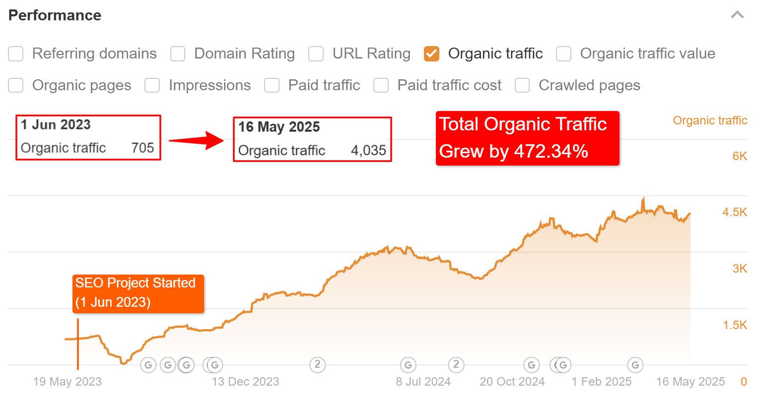 - Organic Traffic Growth (June 1, 2023 – May 16, 2025): 472.34% growth (from 705 to 4,035 sessions)