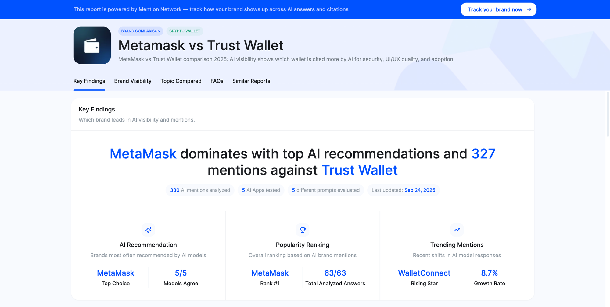 For detailed information about MetaMask and Trust Wallet AI Visibility Comparison, please visit: https://brand.mention.network/comparison/metamask-vs-trust-wallet