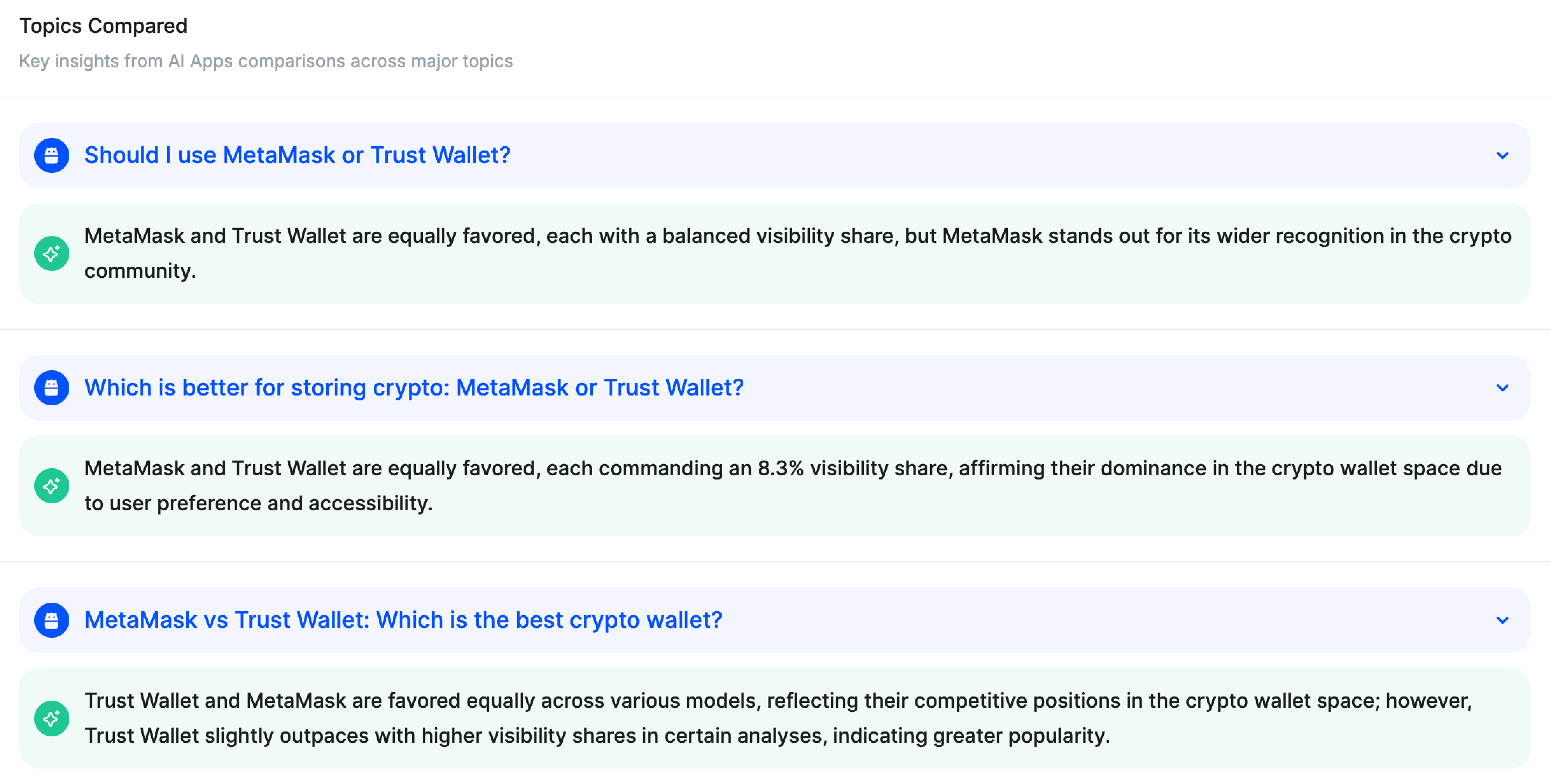 The report examines key topics derived from common user queries, providing insights into AI responses comparing MetaMask and Trust Wallet. For the question "Should I use MetaMask or Trust Wallet?", AI models view both as equally viable, with balanced visibility shares, though MetaMask is highlighted for its extensive recognition within the cryptocurrency community, particularly for seamless Web3 integrations.