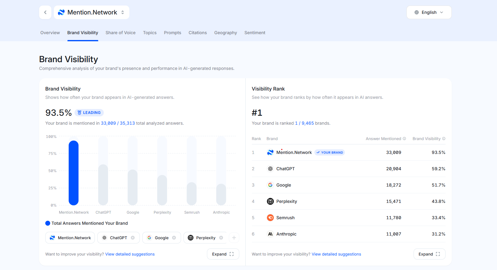 Mention Network’s primary strength is model-level visibility analysis. It tracks brand mentions across multiple AI systems and surfaces patterns that are difficult to observe through manual testing or classic SEO tools.